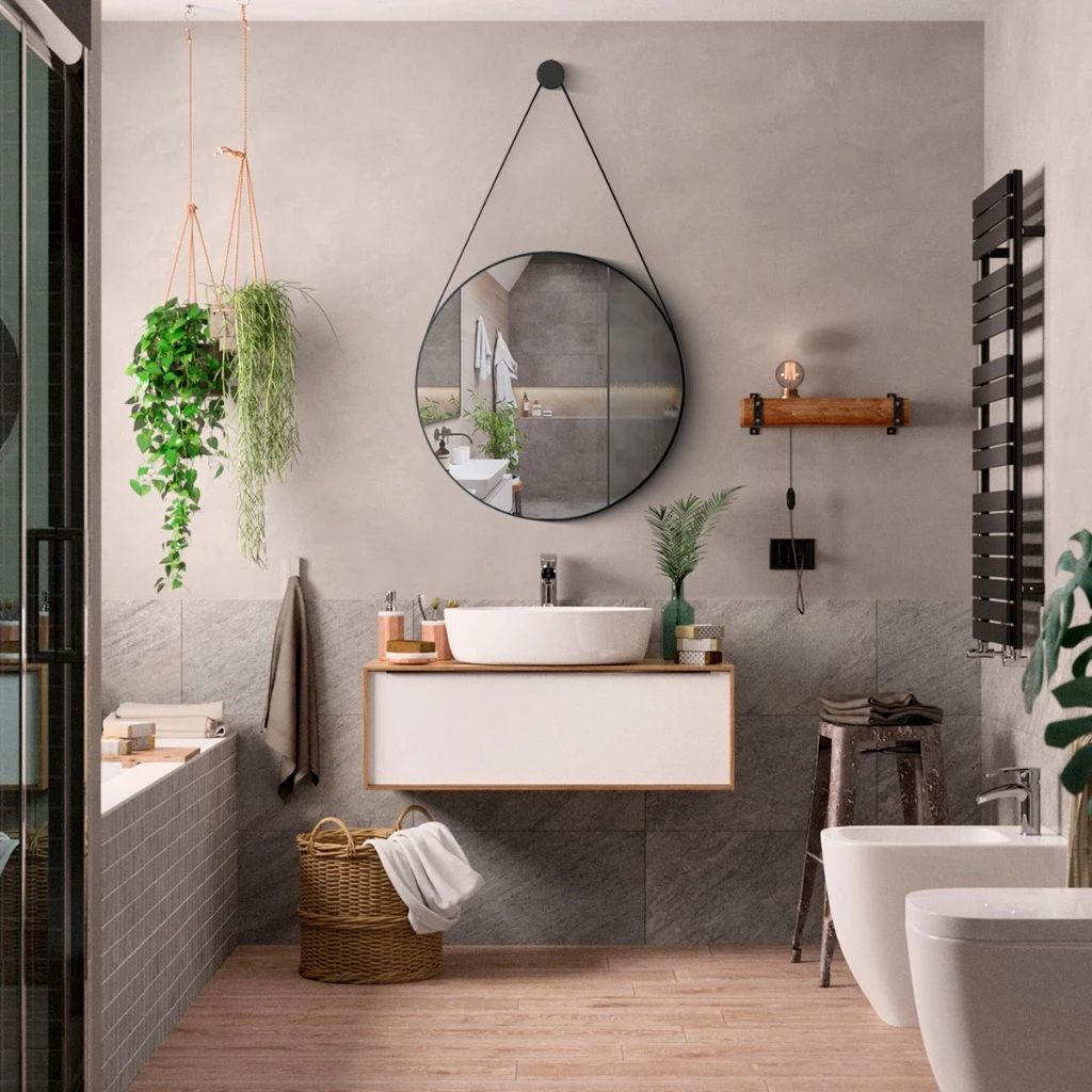 Espelho Adnet Couro Costurado Com Alça + Suporte 60cm 50cm 40cm 30cm Sala Quarto Banheiro Redondo